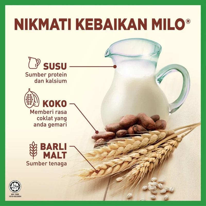Each cup of MILO® has the natural goodness of malt barley, milk, cocoa, 6 vitamins and 3 minerals, plus only ~1 teaspoon of added sugar (sucrose). All these nutritious goodness gives you energy to take on the day!